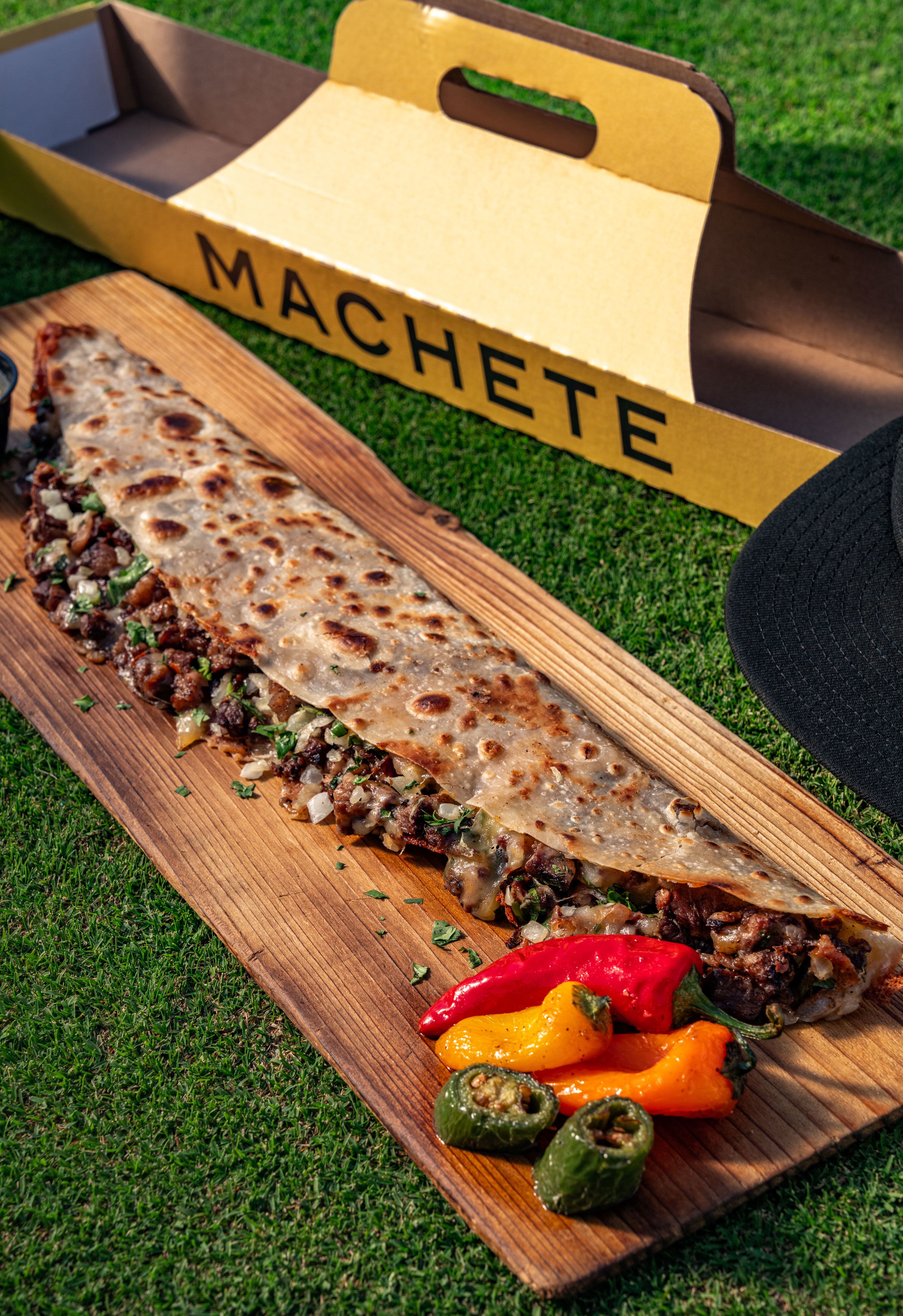 A two-foot flour tortilla brushed with smoky guajillo pepper sauce, grilled with melted mozzarella and Oaxaca cheeses, and packed with carne asada, onions, salsa verde and cilantro. Served in a custom carrying case.